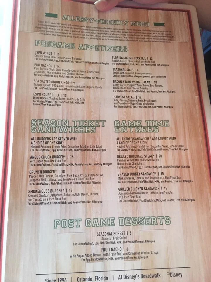 Espn Club Allergy Friendly Lunch And Dinner Menu Gluten Free Dairy Free At Wdw